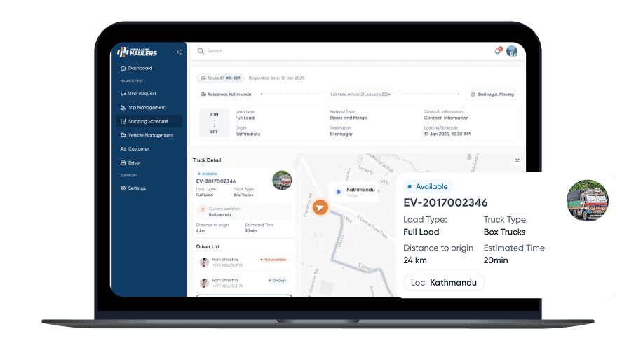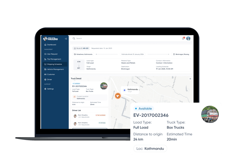 Manage your fleet effortlessly—assign drivers, schedule trucks, and oversee cargo shipping operations in real-time.